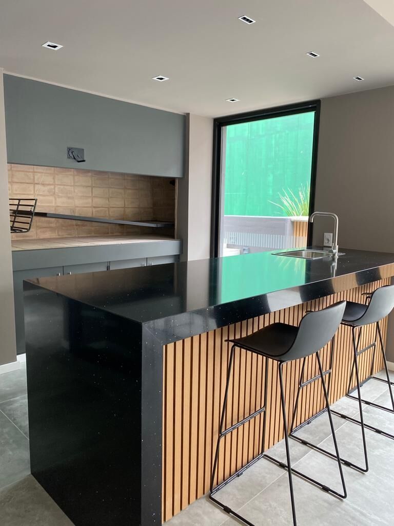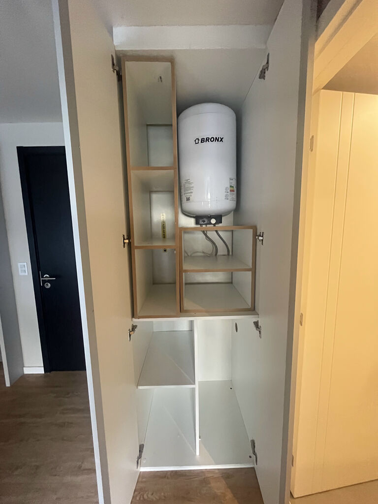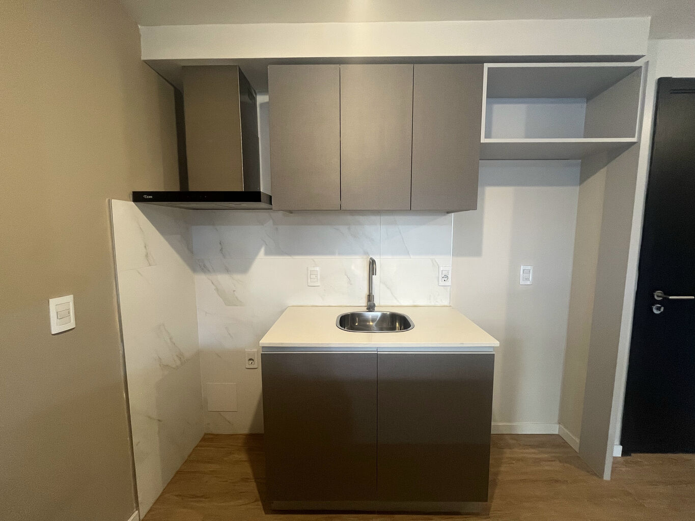 -Living-comedor con aire acondicionado y cocina integrada equipada con muebles bajo mesada, conexión para lavarropas, campana extractora y calefon