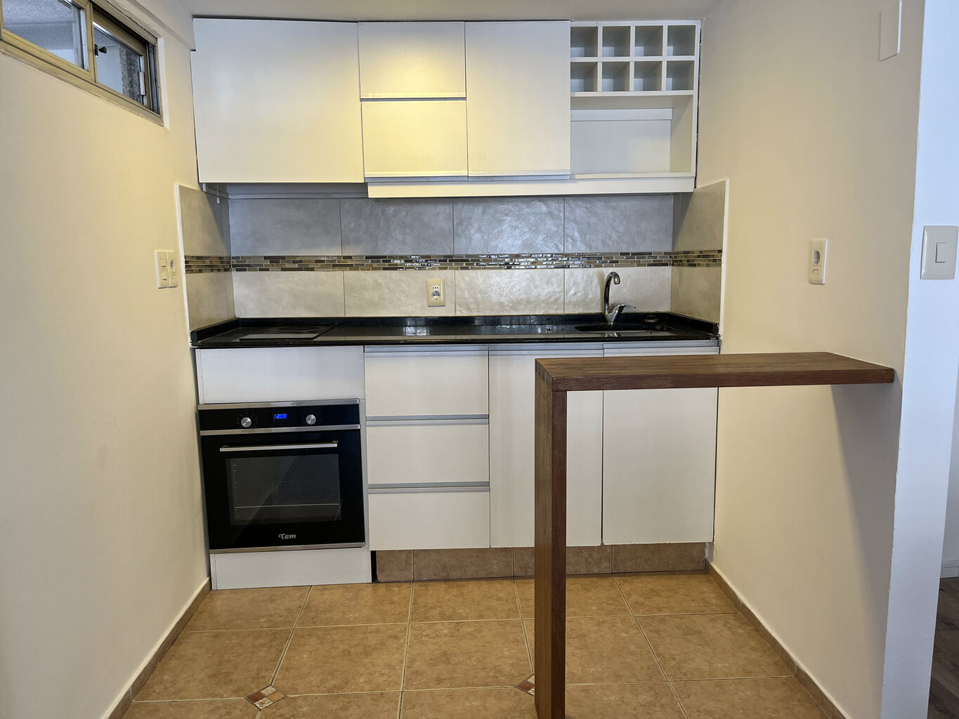 Cocina integrada, equipada con horno empotrado, anafe y campana extractora.