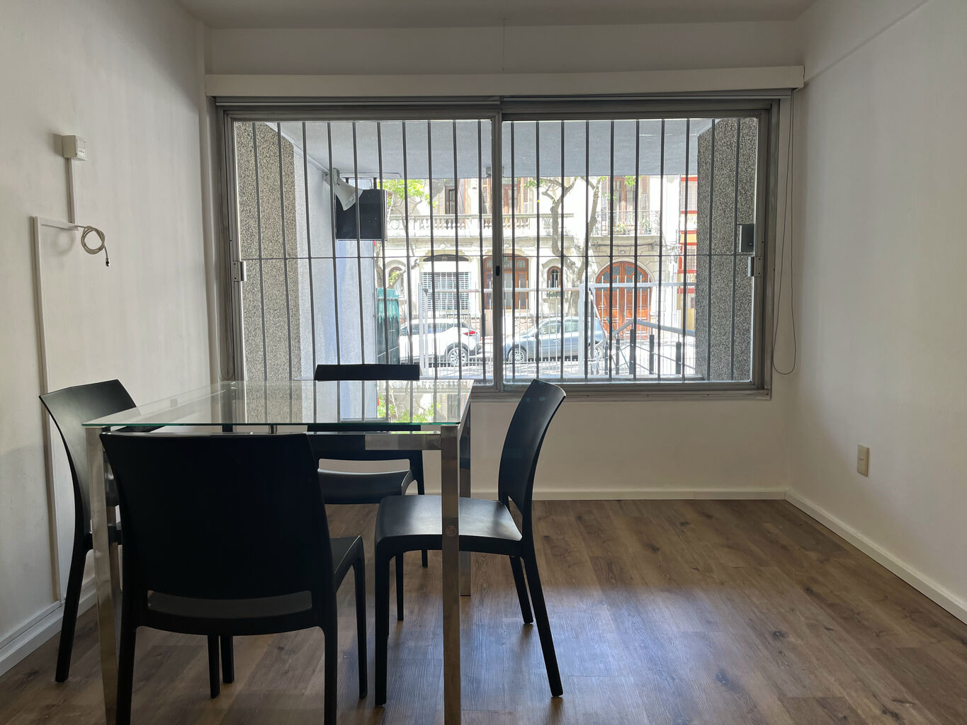 Living comedor luminoso, amueblado con mesa de vidrio moderna y cuatro sillas de diseño.