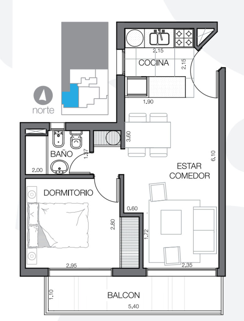 Moderno y luminoso apartamento de 1 dormitorio en excelente ubicación.Características: